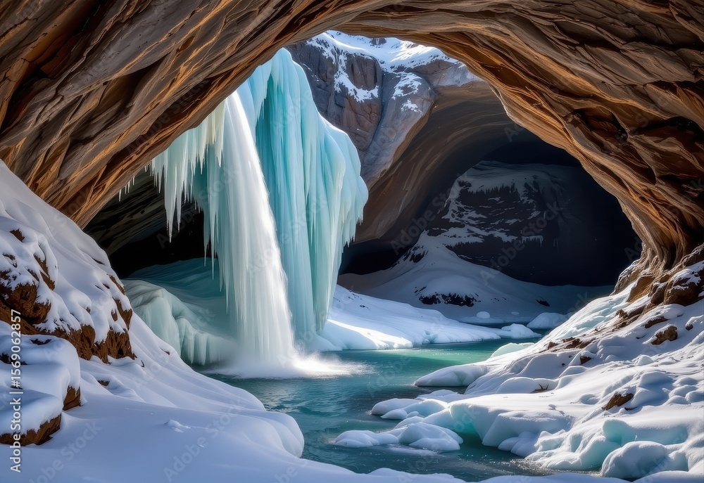 frozen waterfalls inside caves turning to flowing water, ice structures losing integrity due to warming climate. #1569062857