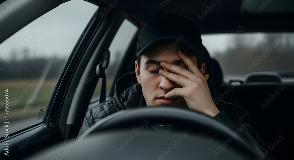 Frustrated Young Man Driving Home After a Long Day A Portrait of Stressful Commute After Working Hours In a Personal Vehicle On an Overcast Day Sadness Depression #1775555074