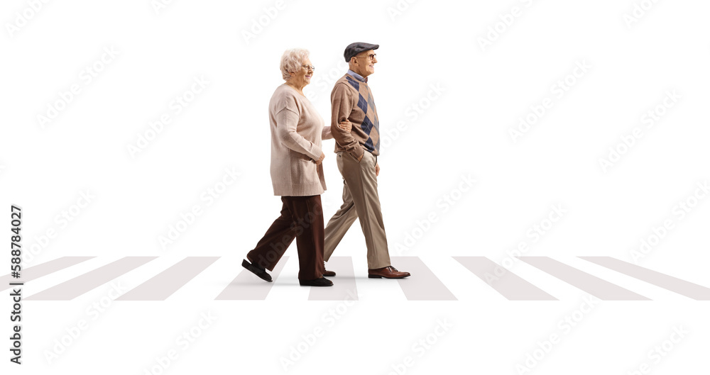 Full length profile shot of an elderly woman holding an elderly man under arm and crossing a pedestrian zebra #588784027