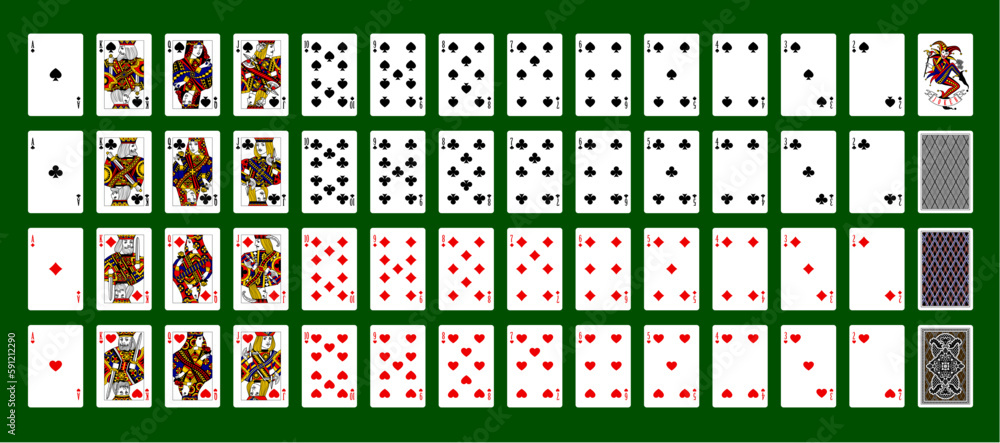 Full set of playing cards with Joker and back sides on green background. Original design. Vector illustration #591212290