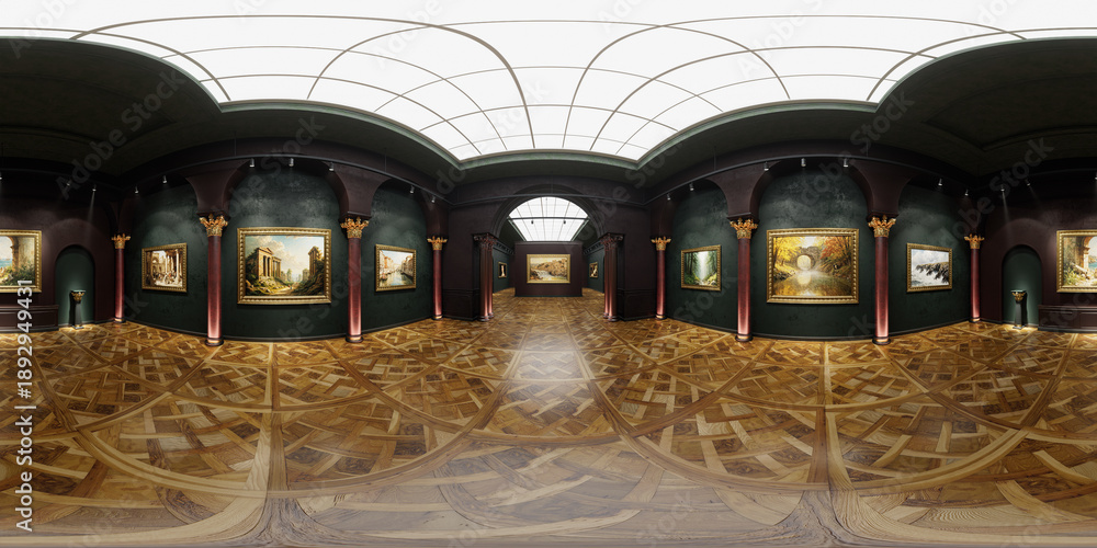 Full spherical 3d hdri panorama 360 degrees of empty old museum art gallery. Artworks in a bright, spacious gallery. 3D render illustration. #1892949431