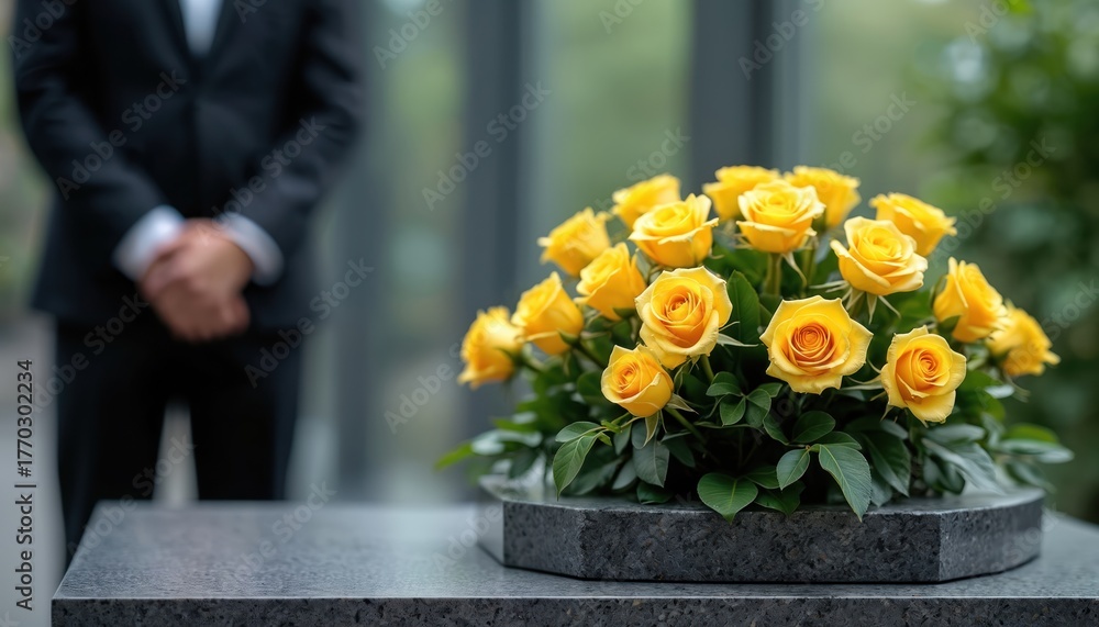 Funeral memorial arrangement with yellow roses displayed near person in suit. Respectful symbol for mourning events. Floral tribute design for commemoration of loss end of life. Condolences #1770302234