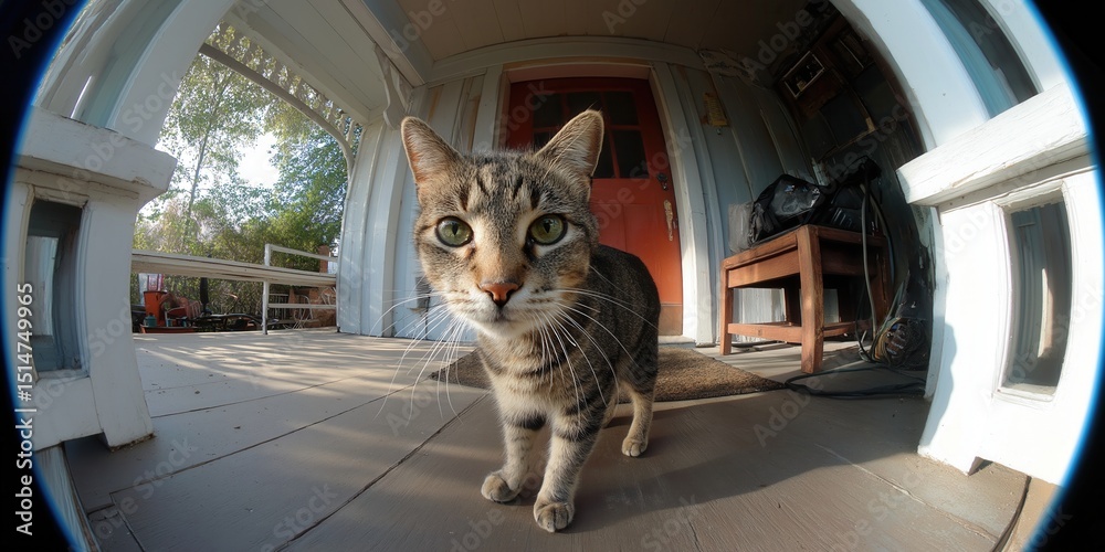 Funny cat viewed through a surveillance camera installed outside the house at a porch. Cat demanding to be fed or let in. Cat caught on security camera. #1514749965