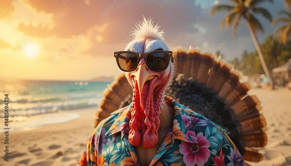 Funny Cool Turkey in Sunglasses Ready For Thanksgiving. A hilarious turkey dressed in a Hawaiian shirt and sunglasses holds a funny Thanksgiving sign. Perfect for memes, social media, and holiday hu #1405494734