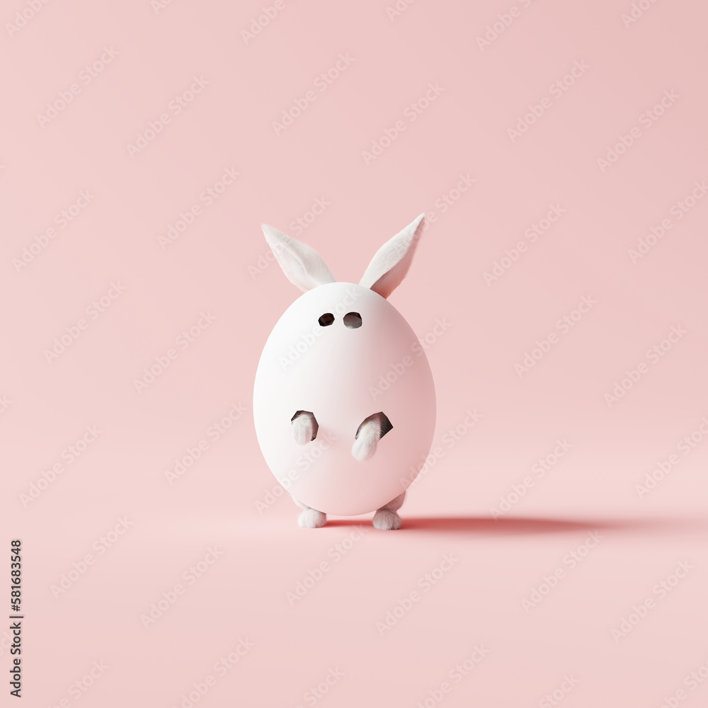Funny Easter bunny in egg costume on pastel pink background. 3d rendering #581683548