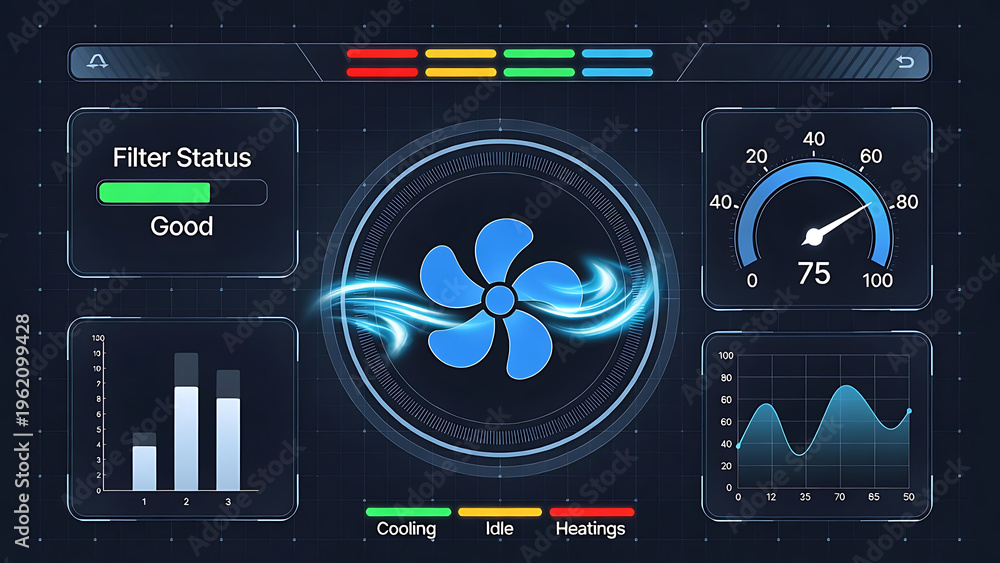 furnace, filter, air, hvac. A futuristic interface displays an air ventilation system's status with charts, a fan icon, temperature gauge, and filter condition indicator. #1962099428