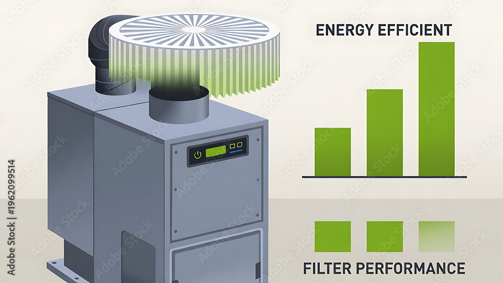 furnace, filter, air, hvac. A modern energy-efficient air filtration unit is shown alongside a bar graph illustrating improved filter performance. #1962099514