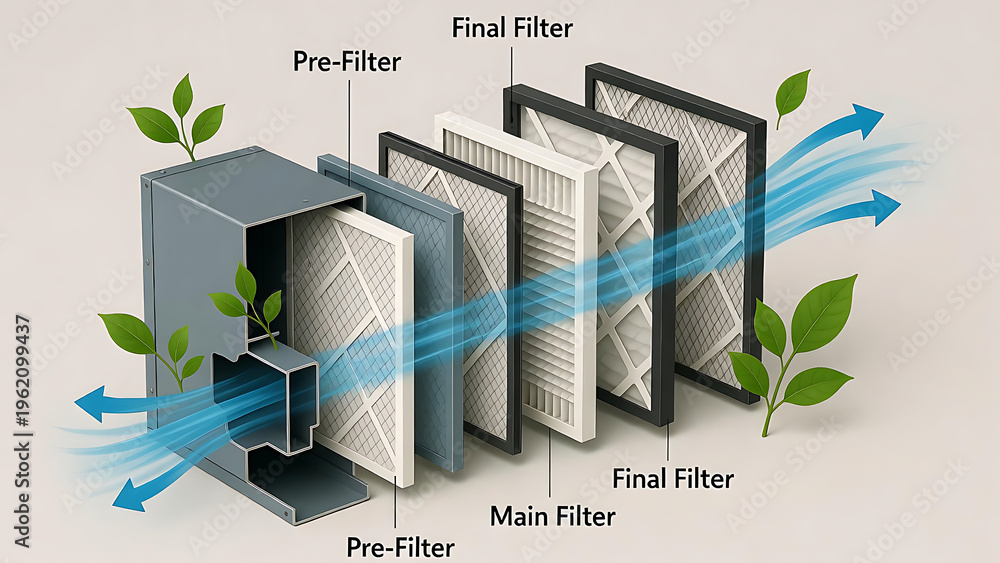 furnace, filter, air, hvac. Illustration of an air filtration system showing pre-filters, main filter, and final filters with clean air and green leaves symbolizing purification. #1962099437