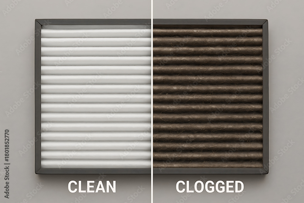 furnace filter air technician. A comparative image showing a clean air filter on one side and a clogged air filter on the other, illustrating the importance of regular maintenance. #1801852770