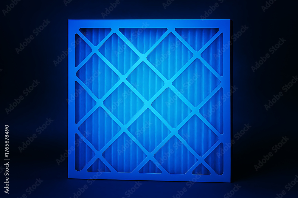 furnace filter air technician. A vibrant blue air filter with a geometric design, showcasing its structure against a dark background, emphasizing its functional aesthetics. #1765678490