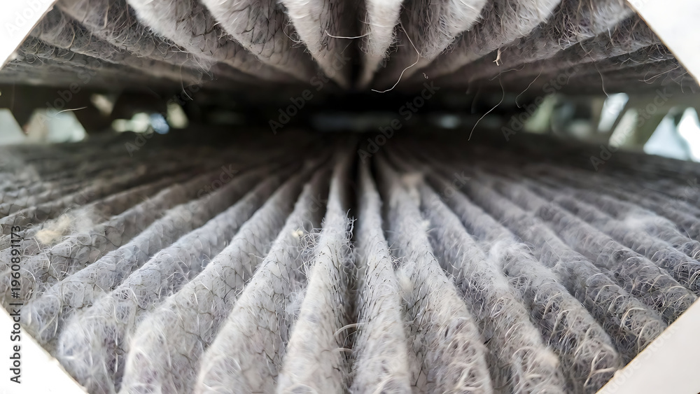 furnace, filter, air, technician, hvac. Close-up image of a heavily dust-clogged air filter showing accumulated fibers and dirt in a vehicle or HVAC system. #1960891173