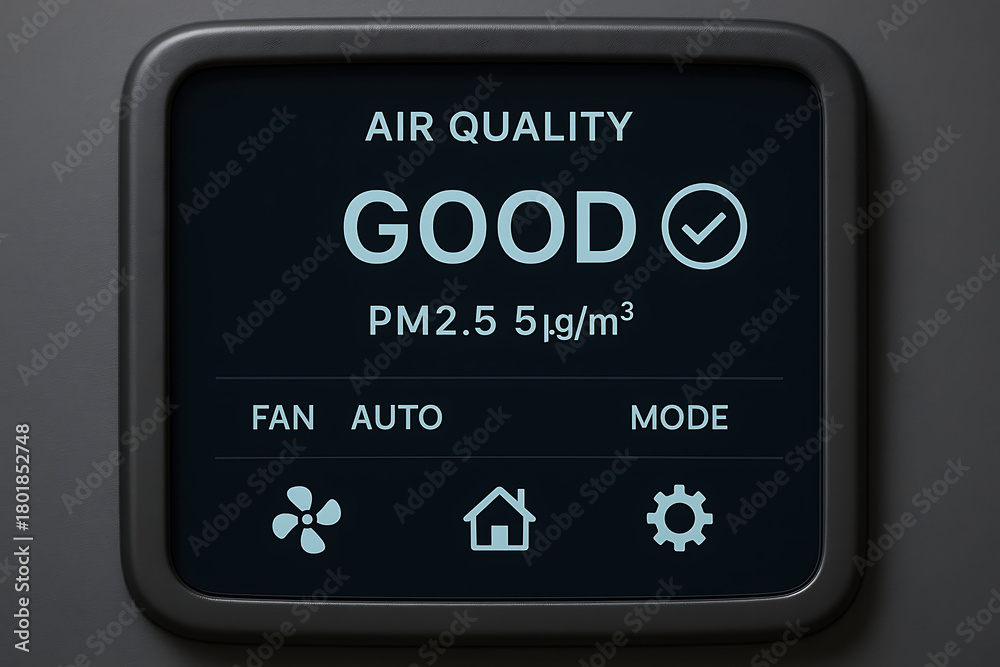 furnace filter air technician. The image displays an air quality monitor indicating "GOOD" air quality with PM2.5 levels and control options for fan, auto, and mode settings. #1801852748