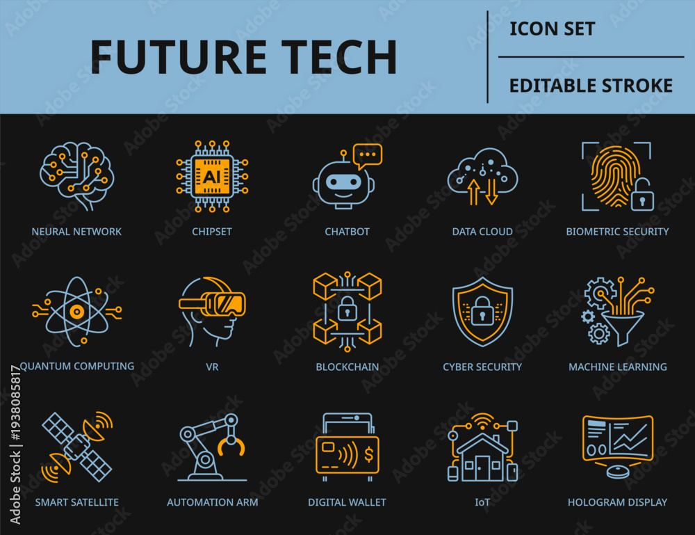 Future technology vector icon set. Editable stroke outline icons of AI, VR, blockchain, IoT, and machine learning for UI design. #1938085817