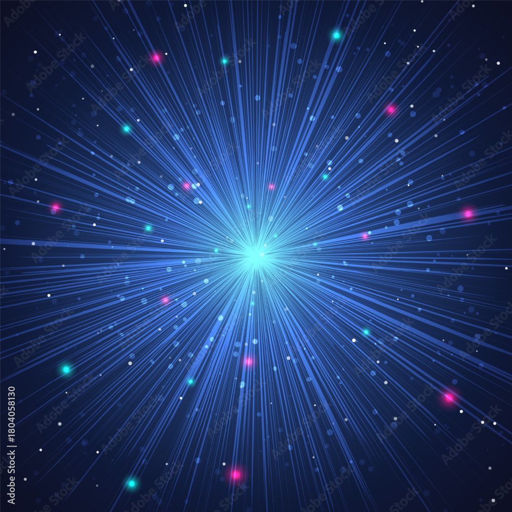 Futuristic Abstract Space Background with Vibrant Cyan Core and Blue Energy Rays A digital vector illustration suggesting a starburst or hyperjump, technology and science concepts #1804058130