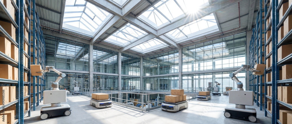 Futuristic automated warehouse facility with robotic arms and autonomous mobile robots transporting cardboard boxes in a bright modern industrial storage center with high shelving units #1909885366