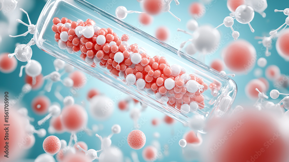 Futuristic bio organic battery concept with red and white molecules in transparent capsule, surrounded by floating molecular structures, symbolizing advanced energy technology #1561705990