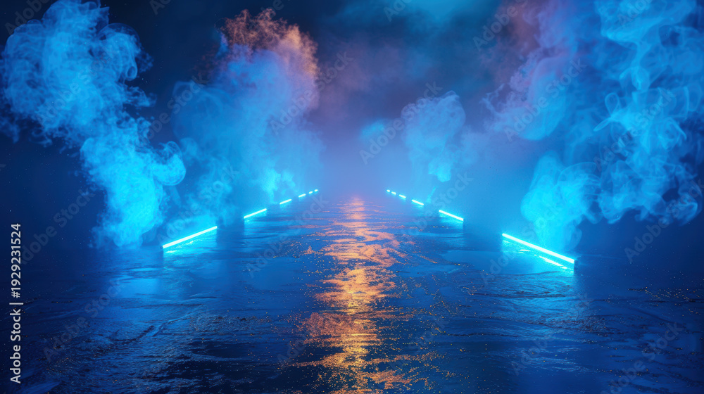 Futuristic Blue Neon Road with Fog and Wet Asphalt Reflection background #1929231524