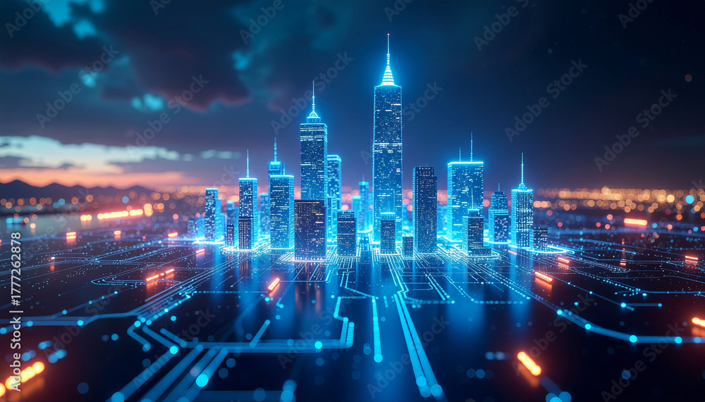 Futuristic cityscape with glowing network connections at night, ideal for tech innovation, smart city solutions, and cutting-edge technology concepts #1777262878