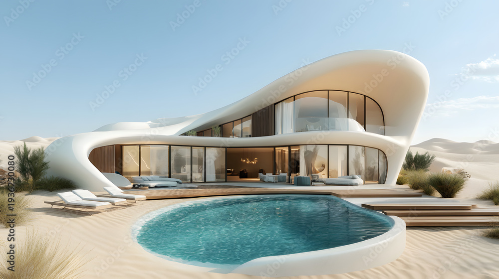 Futuristic desert oasis villa with biophilic design, featuring curved architecture and serene pool, blending seamlessly with sandy landscape #1936230080