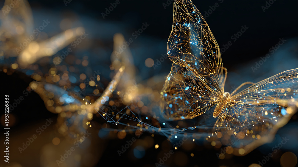 futuristic digital butterflies with interconnected lines and sparkling particles creating abstract cyber network structure in dark illuminated space #1931226833