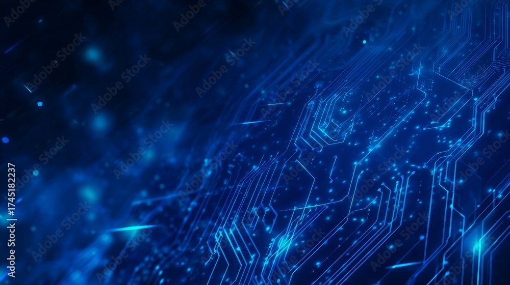 Futuristic digital circuit board background with glowing blue lines and holographic overlays #1745182237