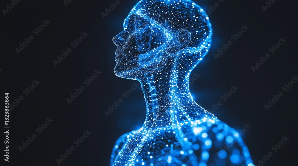 Futuristic digital human silhouette illuminated by glowing blue particles against a dark backdrop #1323863864