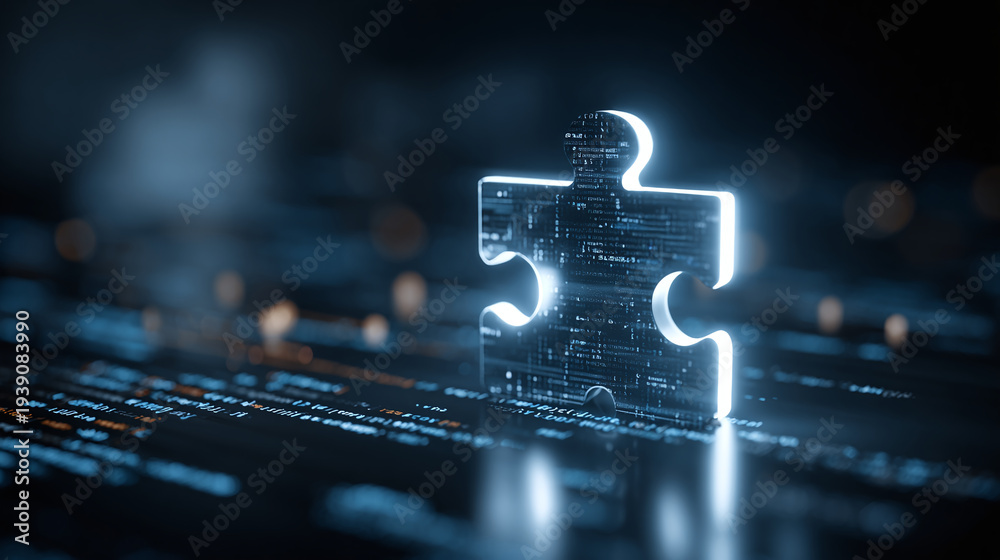 futuristic digital puzzle piece technology illustration with glowing blue interface showing connectivity coding network integration cloud platform data systems and modern software innovation #1939083990