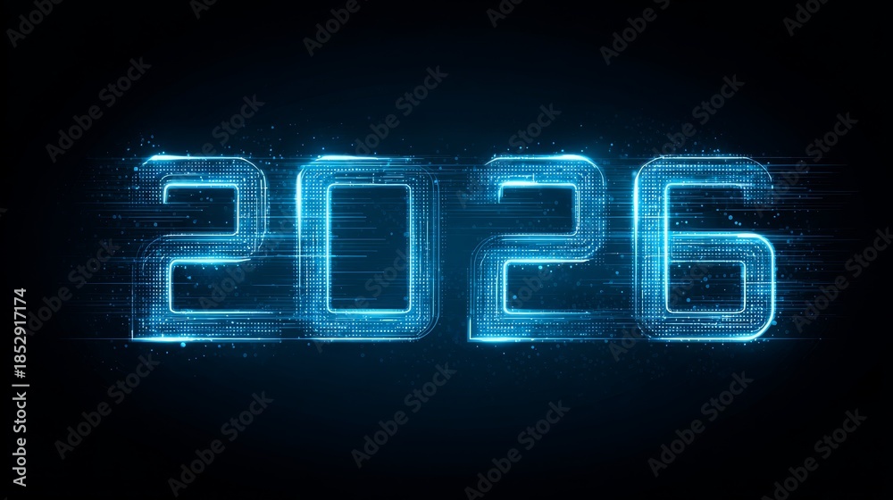 Futuristic digital 2026 text with glowing blue circuit-like patterns on a black background, symbolizing technology advancement. #1852917174