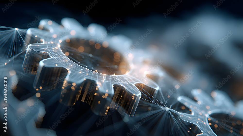Futuristic digital transformation with holographic gears and interconnected networks, showcasing innovation and technology. glowing gears symbolize progress and advanced engineering #1936230018