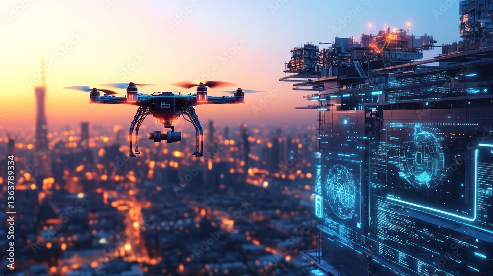 Futuristic drone surveillance over cityscape. High-tech control panel displays data visualizations #1363789334