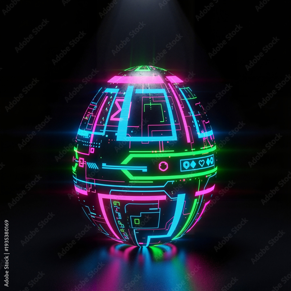 Futuristic egg with pulsating neon lights, symbol of technology and innovation, vivid 3D visualization for creative projects and science fiction #1935380169