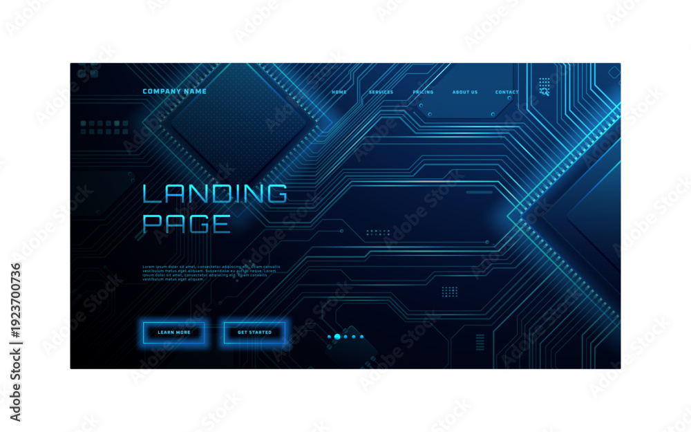 Futuristic electronic circuit template with glowing blue lines. Modern digital tech design for corporate landing pages, presentations, banners, and innovative business concepts. Vector illustration #1923700736