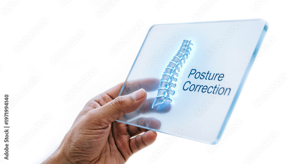 Futuristic health technology featuring a hand holding a transparent tablet with a 3D Posture Correction spine icon. #1971994140