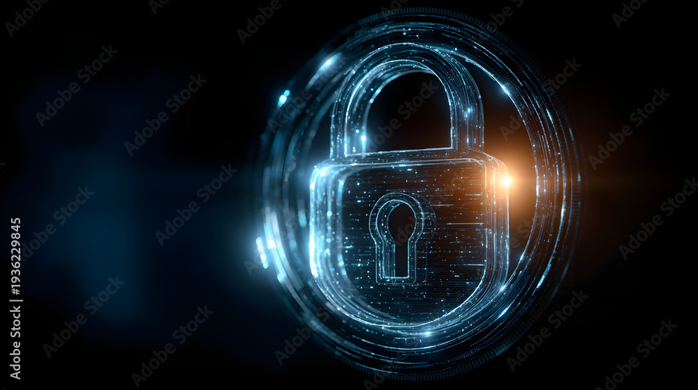 Futuristic holographic glowing padlock symbolizing cybersecurity in digital space. image conveys sense of security and protection with its vibrant blue tones and digital elements #1936229845