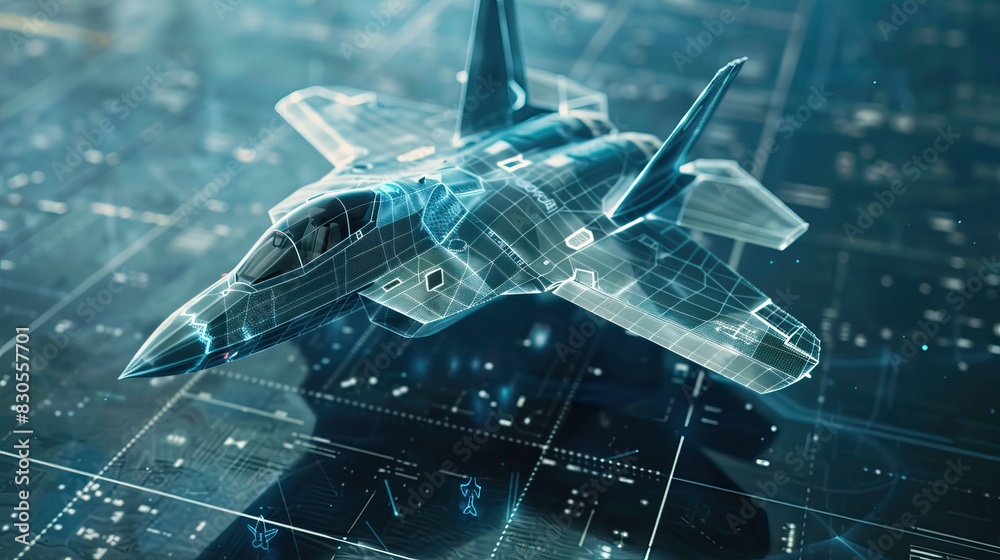 Futuristic holographic jet fighter blueprint with digital interface on dark background #830557701