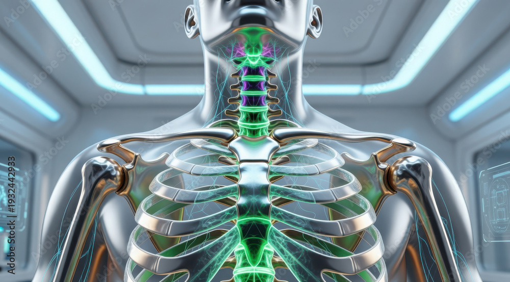 Futuristic human anatomy model with glowing spine and ribcage body skeleton #1932442933