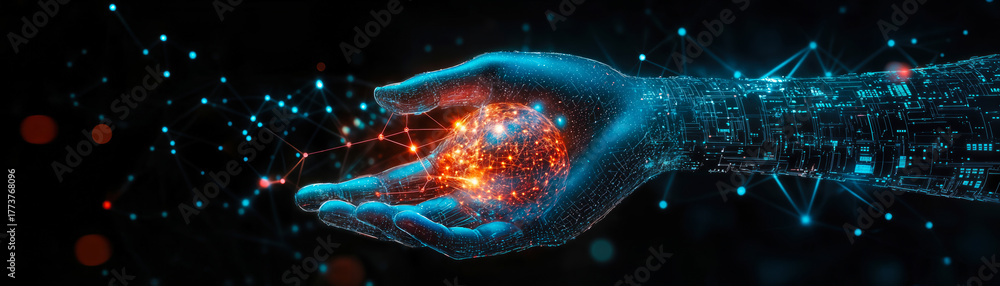 Futuristic Human Hand Interacting with AI Technology and Big Data Network on Illuminated Digital Background for Innovation Concept #1773768096