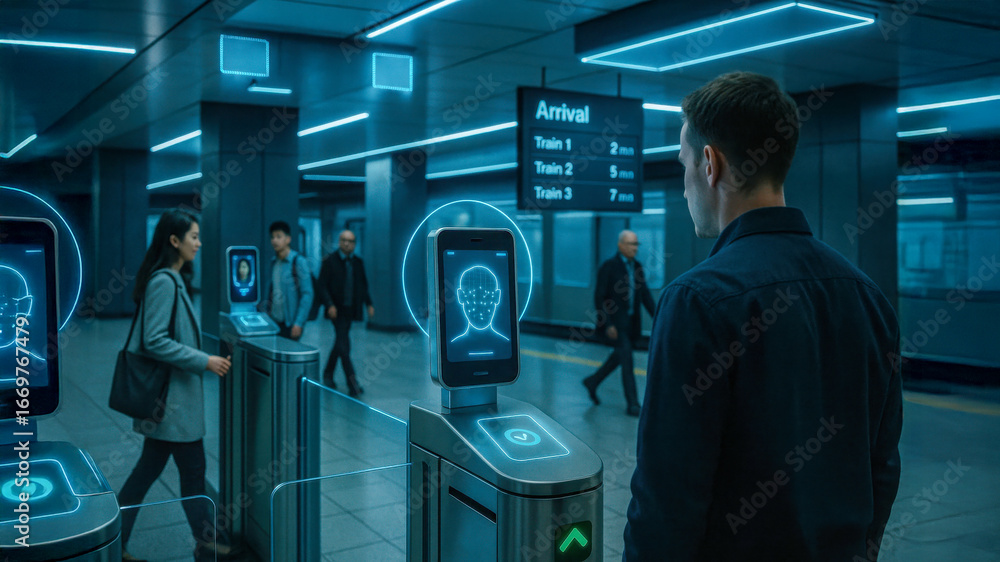 Futuristic metro station with face recognition technology, digital security control system, modern public transport infrastructure, urban innovation and passenger identification network #1669767479