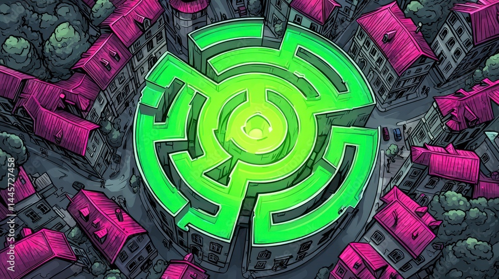 Futuristic neon green labyrinth in the center of an old city with pink rooftops, top view. Digital cyber maze, mysterious urban landscape, fantasy concept art. #1445727458