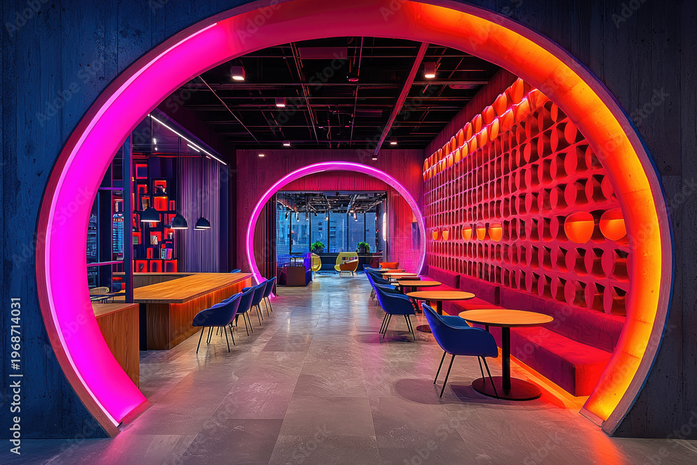 Futuristic Neon Lounge Interior With Circular Archways, Modern Restaurant Seating And Vibrant Colorful Lighting #1968714031