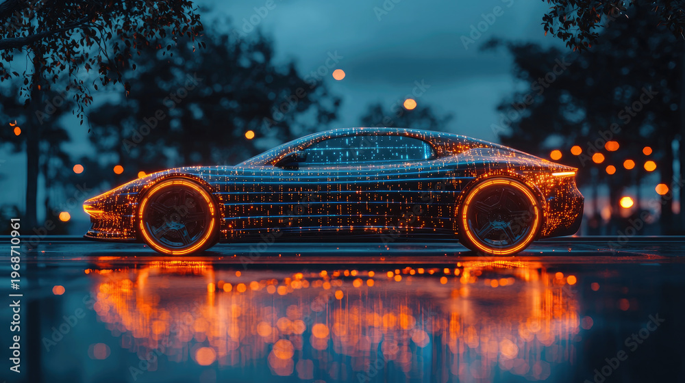 Futuristic Neon Sports Car With Digital Light Pattern and Wet Street Reflection at Dusk #1968710961