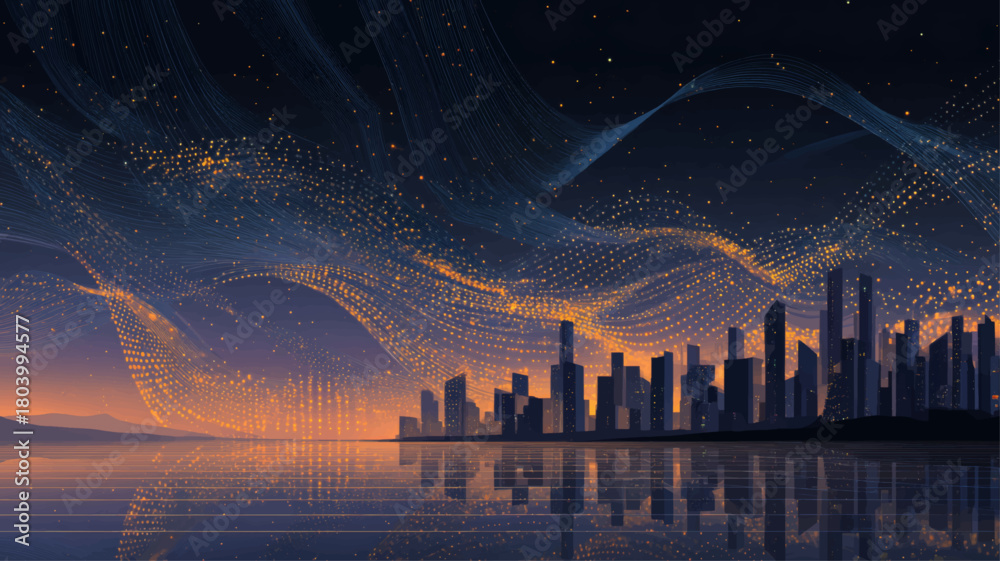 Futuristic night cityscape with glowing Braille-inspired dotted light waves symbolizing accessibility, inclusive communication, and modern disability awareness themes. #1803994577