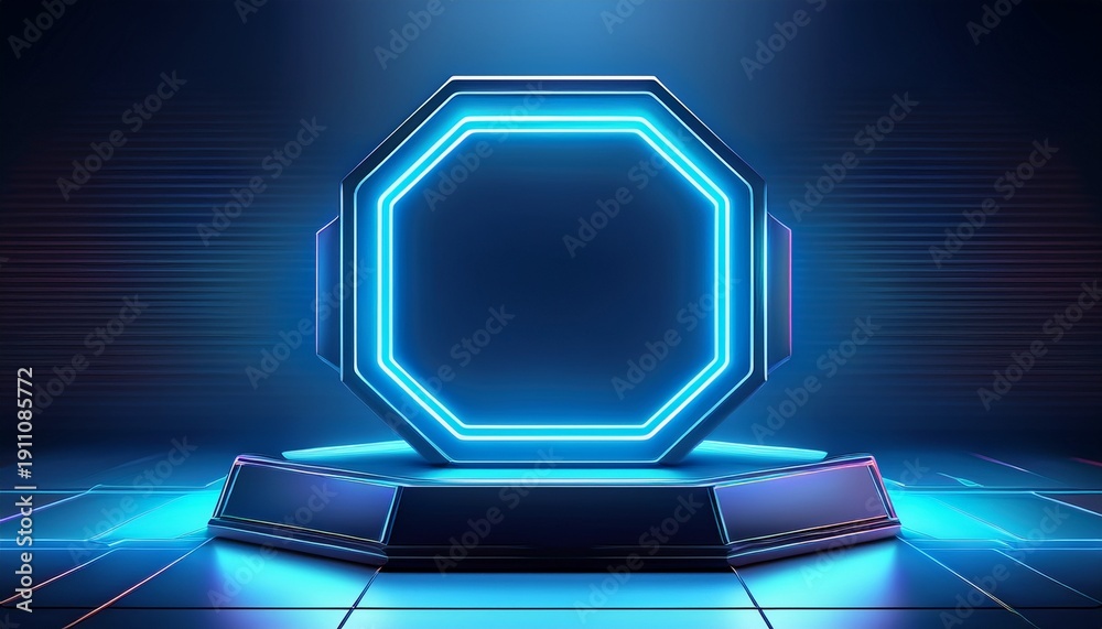 futuristic octagonal podium with neon frame dark blue cyberpunk abstract stage display gaming event showcase tech product presentation dynamic geometric background #1911085772