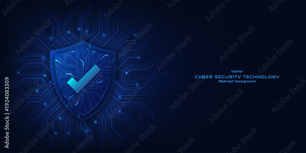 Futuristic protection shield with a checkmark on circuit board. Cybersecurity and privacy defense systems concept. Internet safety antivirus. Symbolizes technological advancement. Vector illustration. #1924083309