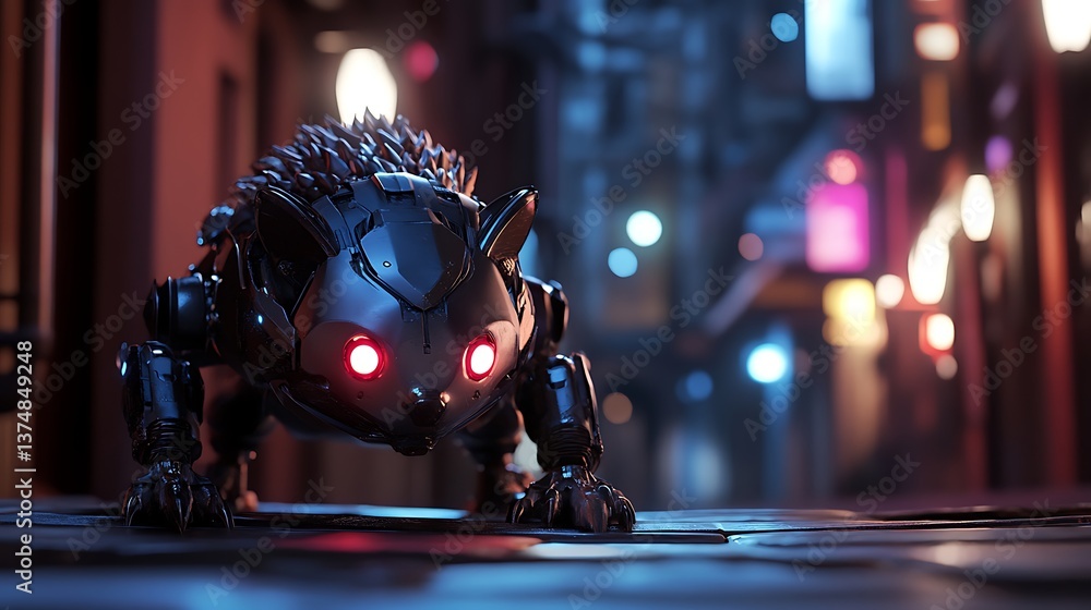 Futuristic robotic animal with glowing red eyes in a dimly lit urban alley surrounded by neon lights #1374849248