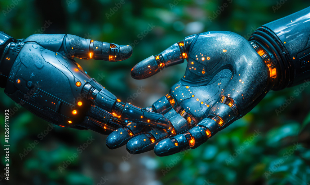 Futuristic robotic hands reaching out to touch with glowing orange circuitry details and synthetic metal textures against blurred natural green background #1826917092