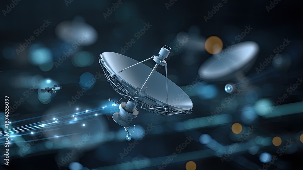 Futuristic Satellite Dishes in Space with Data Streams, Concept of Communication Technology and Information Transfer in a Digital World #1874335097