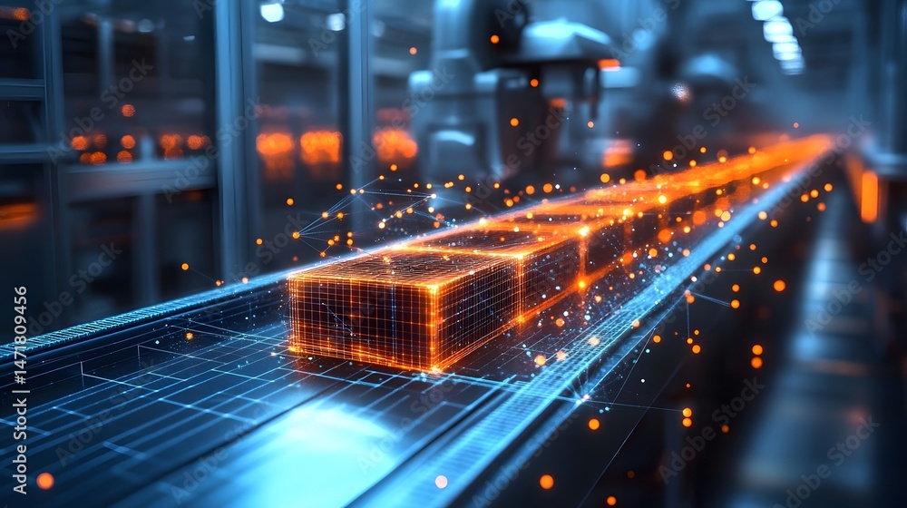 Futuristic scene of a glowing orange cube on a blue conveyor belt, surrounded by data flow visuals. A high-tech factory environment suggests advanced automation. Abstract dark blue wireframe #1471809456