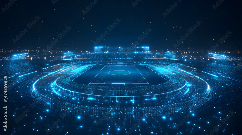 Futuristic soccer stadium at night, rendered in a digital style with glowing blue lights outlining the structure. A neon-lit soccer field and stadium seating stand out. Abstract wireframe in dark blue #1474359629