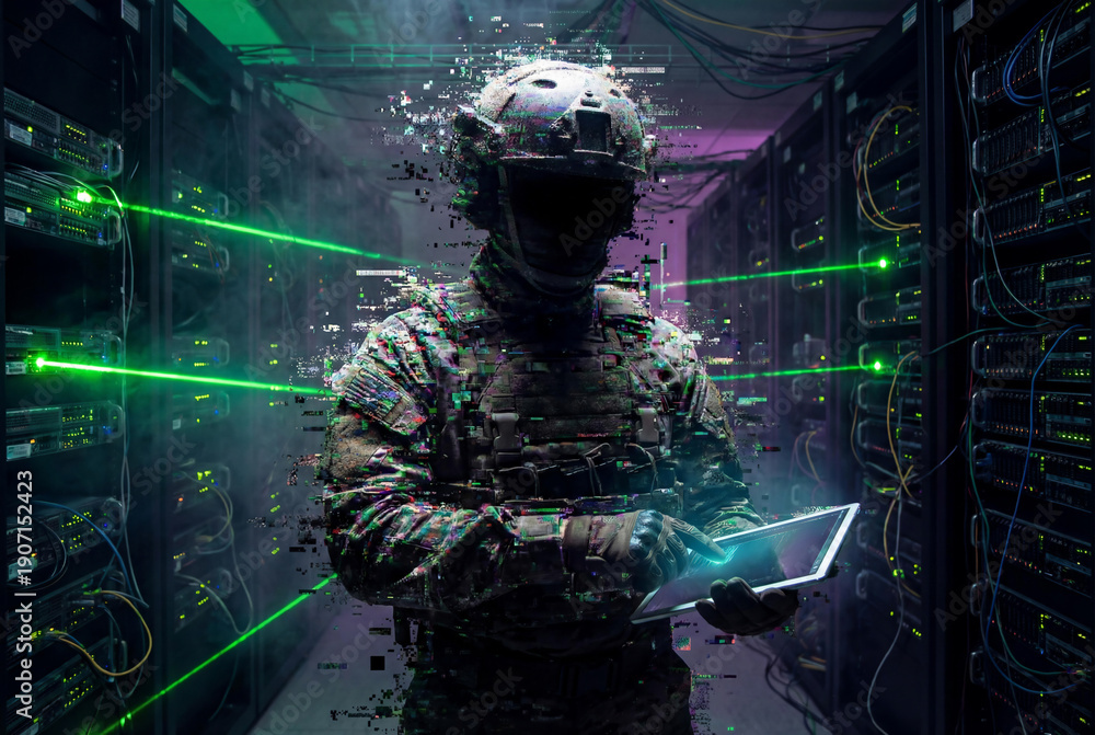 Futuristic Soldier With Digital Glitch Effect Using Tablet In Server Room For Cyber Warfare And Hybrid Conflict Concept #1907152423